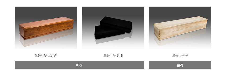 오동나무 관 ㆍ 화장 고급 관 ㆍ 솔송 고급 관 (원산지: 중국, 가공 제조: 한국) ※ 관과 횡대는 제조 공정상 약간의 오차가 발생할 수 있습니다. |